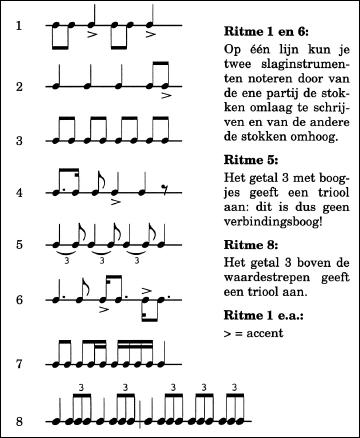 Het steeds maar herhalen van een bepaald ritme heeft een heel eigen werking. Welke werking hangt af van het soort ritme, maar ook van het gekozen tempo. Hieronder staan enige ritmische motieven in vierkwartsmaat.