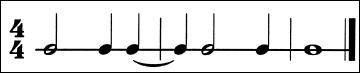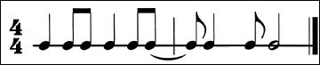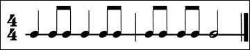 In bovenstaand voorbeeld vind je de 1e syncope in de 1e maat op de 4e tel; de 2e syncope in de 2e maat op de 2e tel.