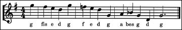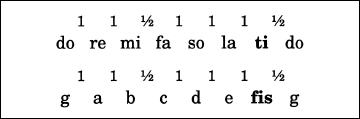 De twee verkeerde afstanden zijn die tussen e - f en f - g. Als je deze g-ladder speelt, hoor je onmiddellijk dat de toon f. niet klopt. Deze toon moet je dus veranderen. De oplossing is: verhoog de f tot fis en alle afstanden kloppen weer.