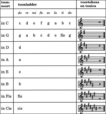Als de toon g in een toonladder de tonica is en alle afstanden kloppen met de ladder van do, dan zeg je: het muziekstuk staat in G gr.t. ofwel de toonsoort is G gr.t. Vooraan de balk, bij de sleutel, noteer je nu een kruis op de f-lijn. Dit betekent: alle tonen f, hoog of laag, worden fis.